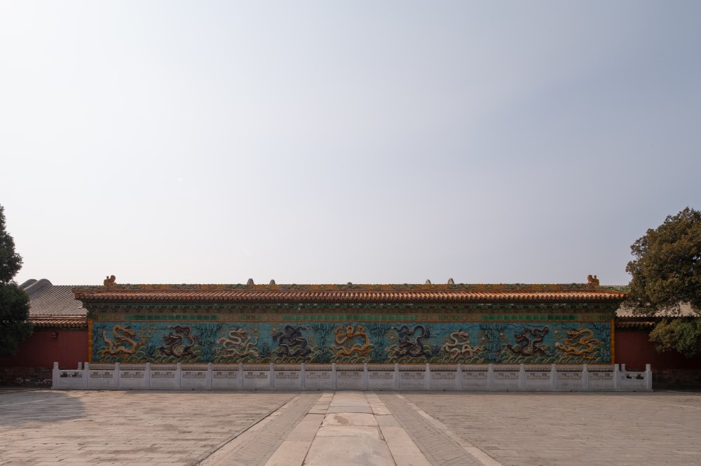 故宫博物院九龙壁与我国山西大同九龙壁、北京北海公园九龙壁合称“中国三大九龙壁”。位于皇极门南面的九龙壁,壁面以云水为底纹,分饰蓝、绿两色,烘托出水天相连的磅礴气势。下部为汉白玉石须弥座,端庄凝重。壁面九条巨龙腾飞于海水之上,黄色正龙居中,前爪作环抱状,后爪分撅海水,龙身环曲,将火焰宝珠托于头下,瞠目张颔,威风凛然,与皇极殿、宁寿宫坐落于南北轴线上,更显威武庄严。